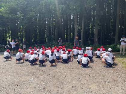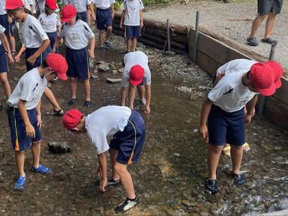 魚つかみの場所に着きました。木立の中にある小川です。つかみ方やつかんだあとのことについて説明を受けました。