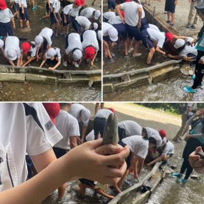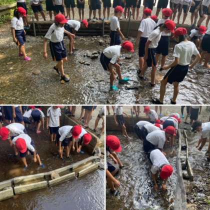 魚つかみを始めました。魚の体表はぬるぬるして、つかんでもすぐに逃げられてしまいます。みんな苦労しながら、徐々につかめるようになっていきました。