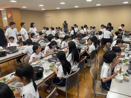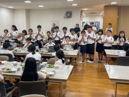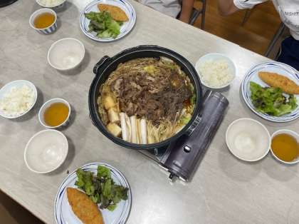 たくさん活動をして、お腹がペコペコになりました。待ちに待った夕食の時間です。メニューは、すき焼きと白身魚のフライです。