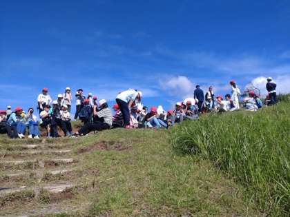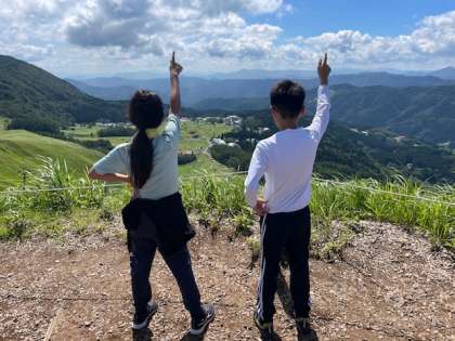 頂上に到着しました! 眼下には、素晴らしい景色が広がっています。思わず達成感を表すポーズをとってもらいました。