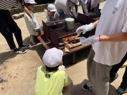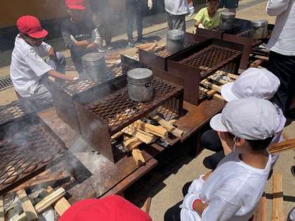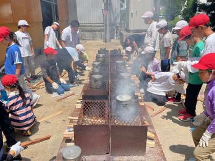 火が安定してきたかまどで、ご飯を炊き始めました。煙が目にしみますね。