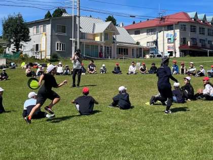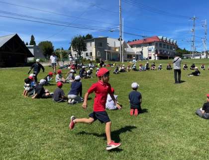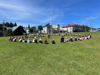 続いての活動は、高原遊びです。まずは、5年生全員が輪になって行うハンカチ落としをしました。