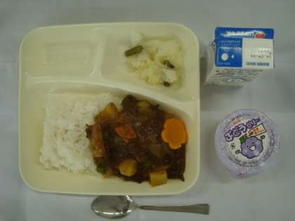 「ビーフカレーライス 野菜のピクルス ぶどうゼリー 牛乳」