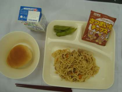 「焼きそば えだまめ おさつチップ(製品) パン 牛乳」