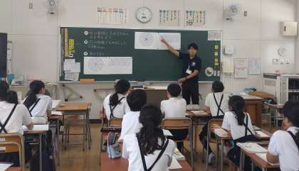 6年生の算数では、円の面積を求める公式について考えました。今までに学習した図形の求め方を使えないか、円を同じ形に等分して並び替えました。すると、細かく等分していくことで、だんだん長方形に似た形になることに気が付きました。そして、並び替えた長方形の縦と横の長さが、円ではどこの長さになるかを確かめ、円の面積を求めることができました。