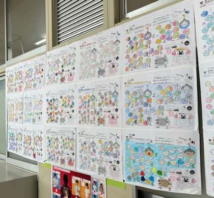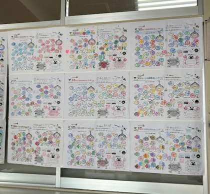 保健室の前に、夏休み中に子どもたちががんばって記録した「はみがきカレンダー」がずらりと並んでいます。みんなが毎日こつこつと一生懸命に取り組んできたことがよくわかります。これからもずっと歯の健康を大切にしていこうね。