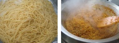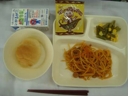 「イタリアンスパゲッティ グリーンアスパラガスとコーンのサラダ カレーフィッシュ ミニコッぺパン 牛乳」