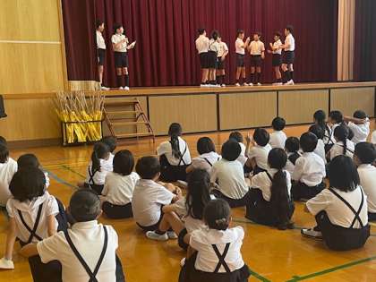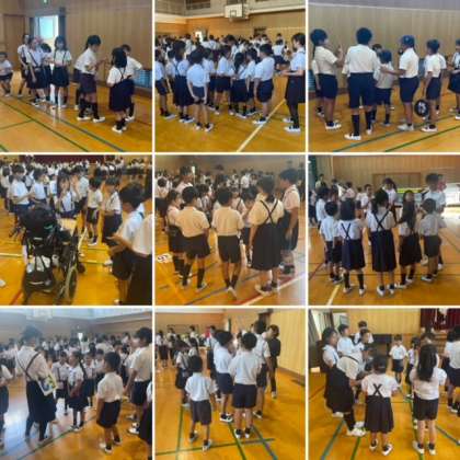 そのあと「サイレント バースデー」というゲームを行いました。言葉を使わずに、身振り手振りで自分の誕生日を伝え合い、誕生日の早い順番に並んでいくというゲームです。高学年を中心に、グループごとに協力しながら素早く並んでいきました。