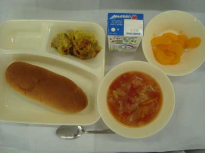 「カレーマカロニグラタン トマトスープ みかん(缶) 黒糖パン 牛乳」