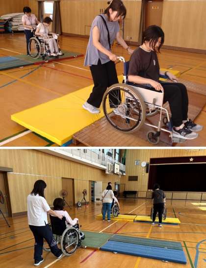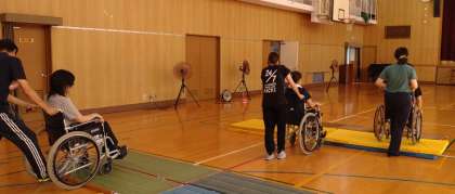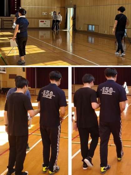 特別支援教育研修会として、教職員が車いすと白杖を体験して、介助の仕方について考えました。車いす体験では、マットを段差に見立て、介助する時に手や足を巻き込まないよう、慎重に移動する仕方を確認しました。白杖体験では、誘導する時に「あと〇歩で一度立ち止まります」「この先〇メートルほどまっすぐ歩きます」など具体的な情報を伝える大切さを学びました。介助をする側、される側それぞれを体験することで、どちらの立場についても考えることができた研修となりました。