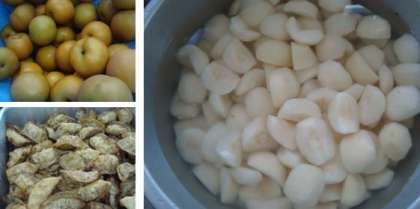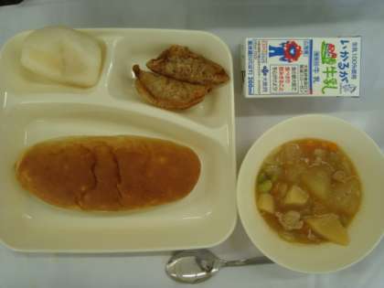 「あげギョーザ 鶏肉ととうがんの中華煮 なし(豊水) おさつパン 牛乳」