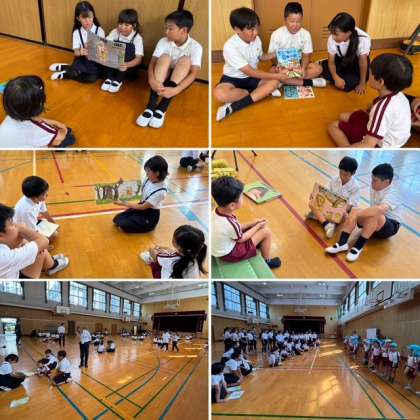 運動会の練習で本校に来ている菅南幼稚園の年長クラスを招いて、5年生の子どもたちが本の読み聞かせを行いました。5年生の上手な読み聞かせに園児さんたちも真剣な眼差しで聴き入っていました。来年度、入学してきてくれる日が待ち遠しいですね。