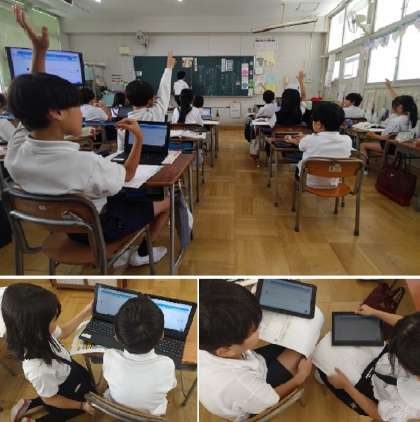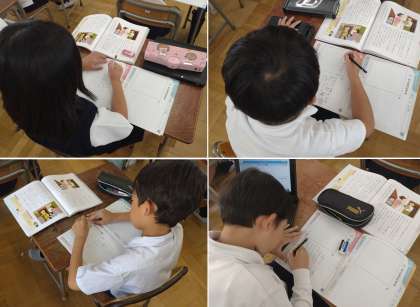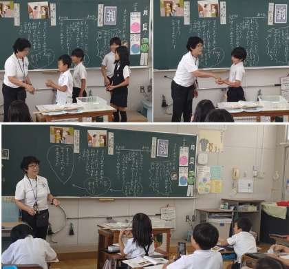 3年生の道徳の時間です。今回は「まどガラスと魚」というお話から、「正直」について考えました。学習者用端末を使用して、自分と友達の考えを比べたり、学習する中で考えがどのように変化したのかを大型画面で確かめたりしました。また、登場人物と同じ行動を実際に演じることで、正直でいるとどのような思いになるかを、しっかりと考えることもできました。
