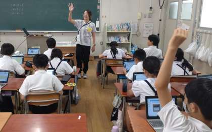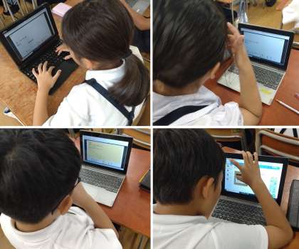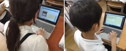 4年生の算数では「式と計算の順序」について学習しています。今日は、黒石と白石が並んだ絵を見て、合計の数を1つの式であらわして求めました。立てた式について、どのように考えたのかを言葉や図で説明するために、学習者用端末を使って図にまとまりの印をかき込んだり、文章を打ったりしました。