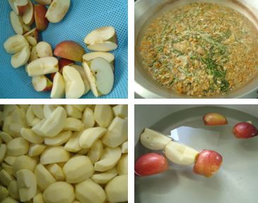 「中華煮 大学いも りんご レーズンパン 牛乳」