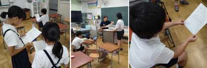 高学年児童が、運動会本番のために前日準備に取り組みました。得点係では、自分が担当する競技や点数の用紙への記入のしかたについて確かめました。放送係では、競技や演技の紹介アナウンスの原稿を読む練習をしました。運動会当日は、自分の出番以外でも運動会を支える高学年児童たちの活躍へ、ぜひ温かいエールをお願いします。