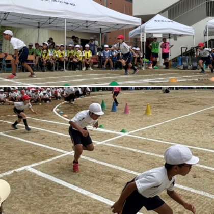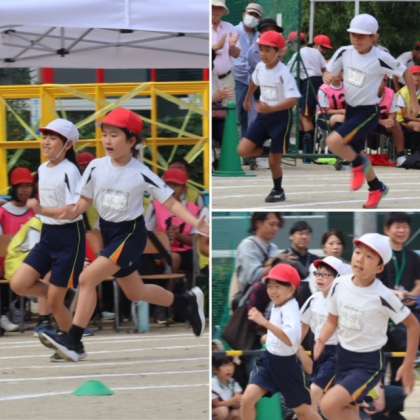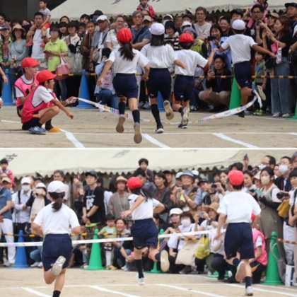 続いて、3・4年生の「徒競走」です。スタートの仕方が上手になり、勢いも増してきました。力強くゴールテープを切っていきます。