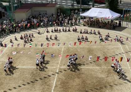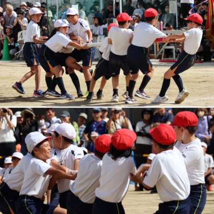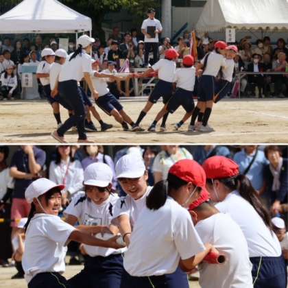 5・6年生の「棒引き」です。力と力がぶつかり合い、粘り強く引き合います。最後まであきらめない姿が立派です。