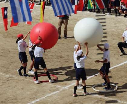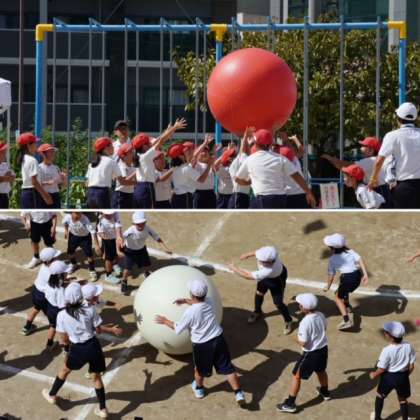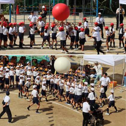 全校競技の「大玉送り」です。6〜4年生は頭上に掲げて、3〜1年生は地面を転がして、大玉を送っていきます。最後に大逆転が待っていました。