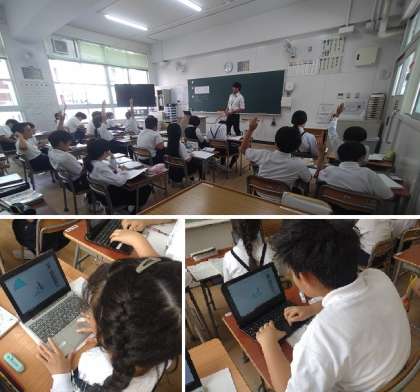 5年生の算数では、図形の面積の求め方について学習しています。今回は、三角形の面積をどのようにすれば求められるのかを考えました。まず、今までに学習した図形の面積の求め方について確かめました。そして、一人一台学習者用端末を活用し、三角形を組み合わせたり、形を変えたりし、面積の求め方を考えました。さらに、自分の考えを友達と伝え合い、三角形の面積を求めるための公式について学びました。