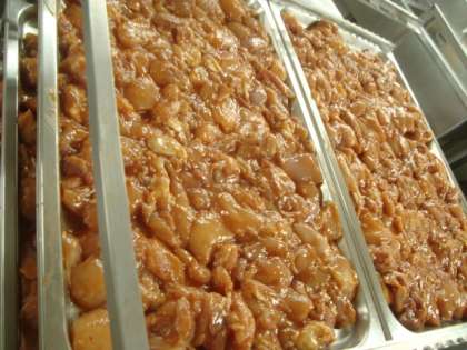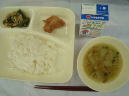 「鶏肉のチリソース焼き 焼き豚のスープ ツナと三度豆のオイスターソースいため ごはん 牛乳」