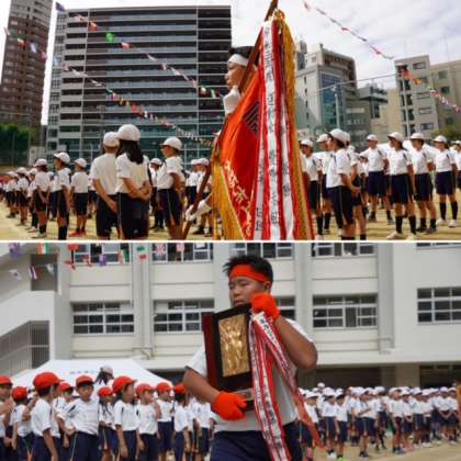 すべての競技・演技が終わり、閉会式となりました。いよいよ子どもたち注目の得点発表です。白組・赤組それぞれの応援団長が、優勝旗と準優勝盾を手に、互いの健闘をたたえ合いました。