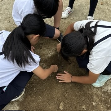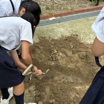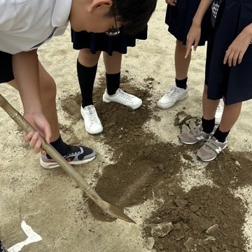 6年生の理科の時間です。「大地のつくり」という単元で、地層の学習をおこなっています。今回は、運動場の地下に地層があるのか、実際に地面を掘って確かめてみました。「疑問をもったら調べてみる」という姿勢は大切ですね。