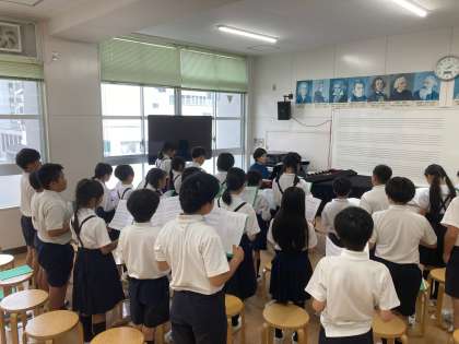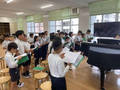 5年生の音楽では、歌唱曲「翼を抱いて」の学習に取り組んでいます。低音の出だしからはじまるこの曲は、終盤に向かって途中から曲調が大きく変化する、ダイナミックな構成の曲です。美しい歌声が教室に響いていました。