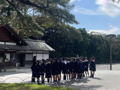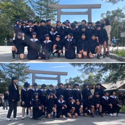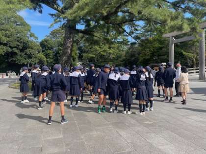 最初の目的地である「伊勢神宮」に到着しました。まずは、入口の鳥居のところで、クラスごとに記念写真を撮りました。
