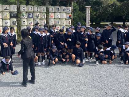神宮に奉納されている三重県産清酒がずらりと並んだ前では、学年全体で記念写真を撮影しました。
