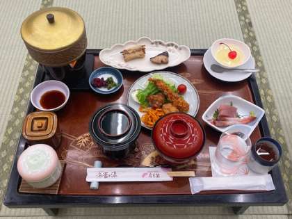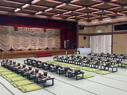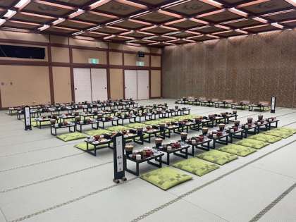 クラスごとに入浴したあと、いよいよ夕食の時間となりました。大広間には、すでに立派なお膳が整えられています。