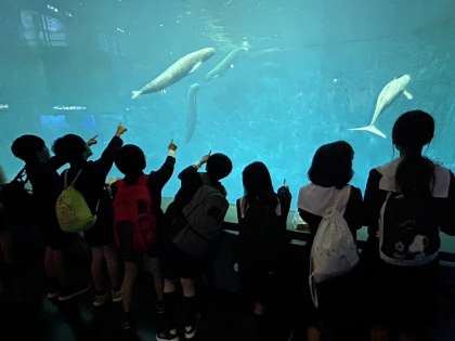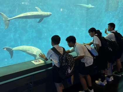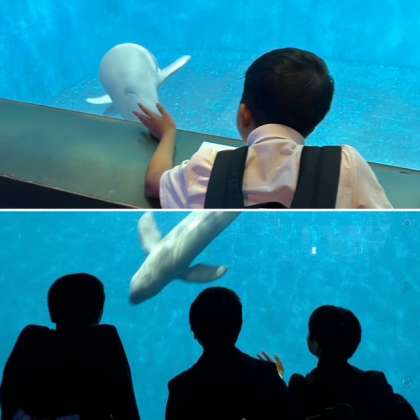 ここは「伊勢志摩の海」の水槽です。イルカの仲間のスナメリが、気持ちよさそうに泳いでいます。