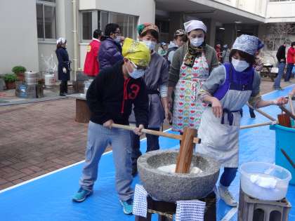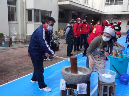子どもたちは慣れない手つきながら、「ぺったん、ぺったん」ともちつきを楽しみました。ついたもちを自分たちで丸めて、美味しそうなおもちに仕上げました。