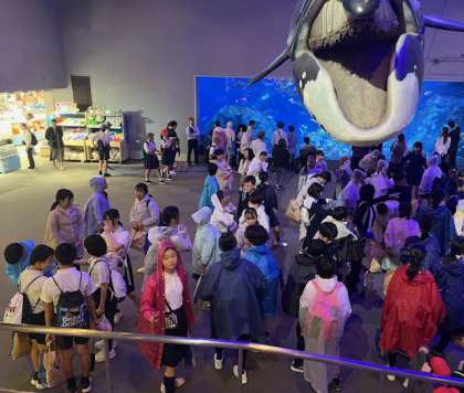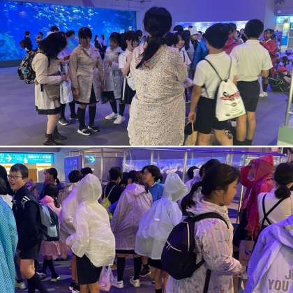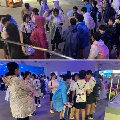 集合時刻となりました。各グループが次々とエントランスホールに集まってきます。外は雨が降っているため、バスの駐車場まで行く際に濡れないように、雨ガッパを着用しました。
