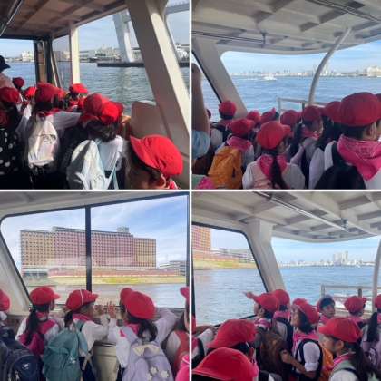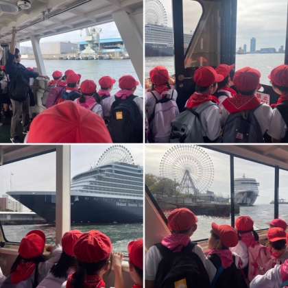 船が出航しました。ホテルの大きな建物や観覧車、停泊している豪華客船などがよく見えました。