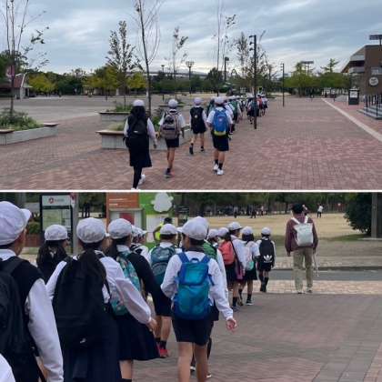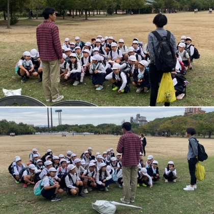 長居公園に着きました。このあと芝生広場で遊ぶ際の留意点について、先生からのお話を聞きました。