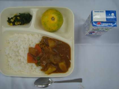「ポークカレーライス ほうれんそうのソテー みかん 牛乳」