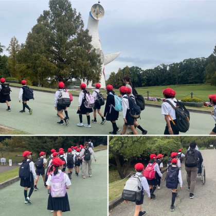 万博記念公園駅に着きました。公園のシンボル「太陽の塔」が見守る中、緑豊かな公園内を散策します。