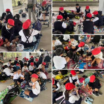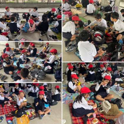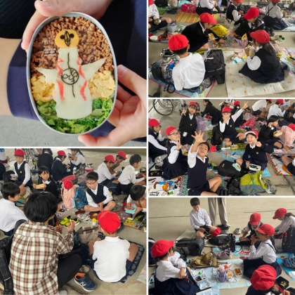 屋根のある団体休憩所をお借りして、お弁当タイムにしました。みんなでお家の人の心のこもったお弁当をいただきます。見事な「太陽の塔」仕様のお弁当もありました。