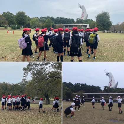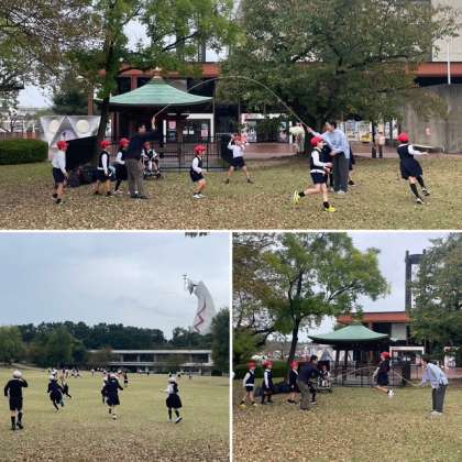 パビリオンを出るとちょうど雨があがっていたので、広い芝生広場で遊ぶことにしました。鬼ごっこや大縄、落ち葉シャワーなどで、みんな思い思いに楽しく遊びました。