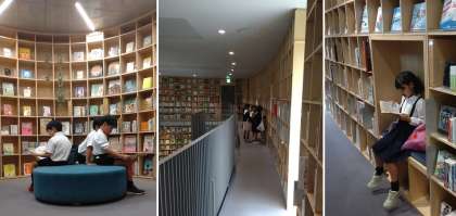 約2万冊あるという蔵書に子どもたちはワクワク。どんな本があるのか、どの本を読もうか、館内を散策して見つけていき、一人ひとり気に入ったスペースで読書の世界に入り込んでいました。