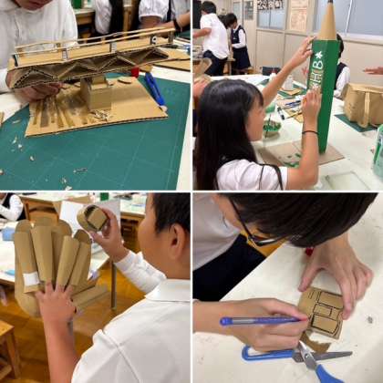 5年生が図画工作の時間に「ダンボールで試して作って」という学習をしています。ダンボールの性質や特徴から表現したいものを考え、段ボールカッターや工作ばさみ、接着剤などの道具を使って作品を作ります。巨大えんぴつ、電車、野球グローブ、橋など、一人一人の「自分らしさ」が表れる作品ばかりです!