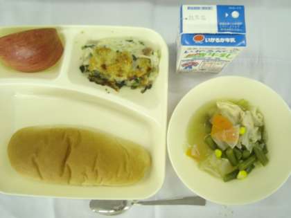 「ほうれんそうのグラタン スープ煮 りんご 黒糖パン 牛乳」