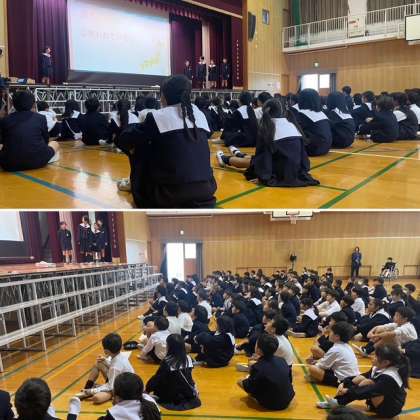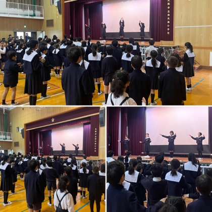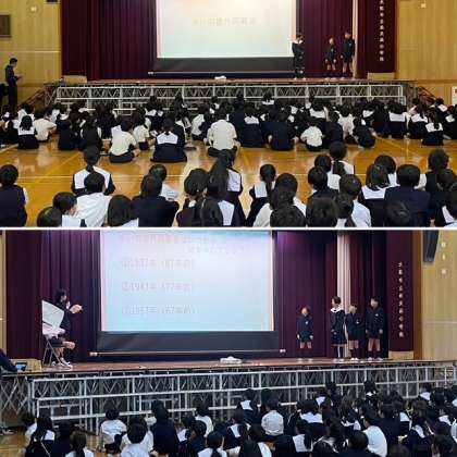 金曜日の児童集会の様子です。運営委員会の子どもたちが「赤い羽根共同募金」の取り組みについて説明しました。クイズや自分たちで考えたダンスも交えながら、楽しくピーアールすることができました。