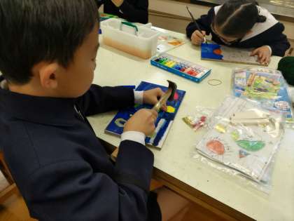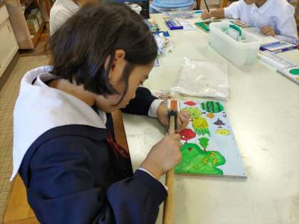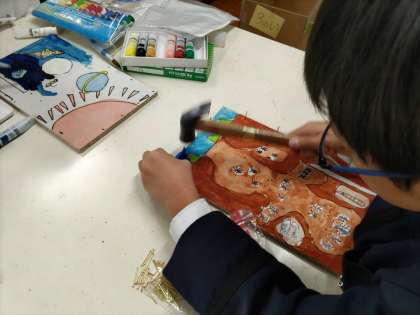 3年生は、図画工作の学習で「くぎ打ちゲーム」をつくっています。絵を描き絵の具で色を付けた板に、かなづちを使ってくぎを打ちます。初めてのかなづち、手を打たないように慎重に取り組むことできました。