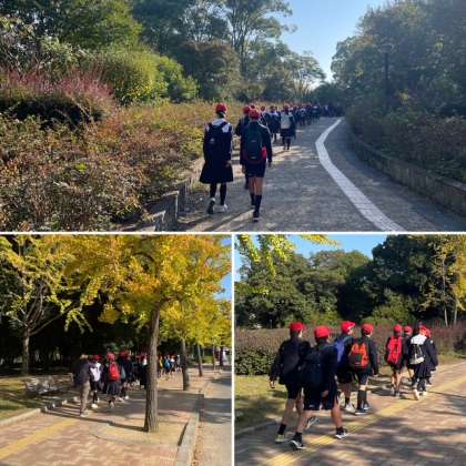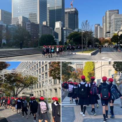 6年生の子どもたちが、ヤンマースタジアム長居で開催されたスポーツ交歓会に参加しました。素晴らしい秋晴れのもと、色づいた樹々が美しい長居公園に到着しました。