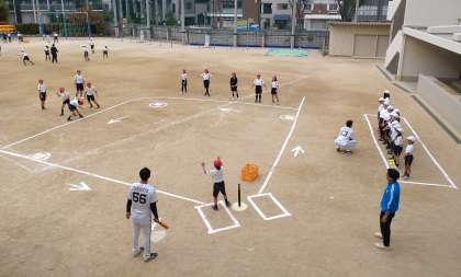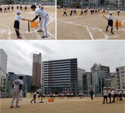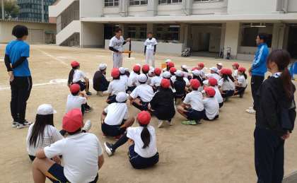 オリックス・バファローズのOBコーチの方々が、2年生と4年生にティーボール体験の出前授業をしてくださいました。ティーに置かれたボールを打つティーボールについて、バットの持ち方や振り方、点数の入り方等を分かりやすく教えていただき、子どもたちも楽しくいきいきと体験に取り組むことができました。