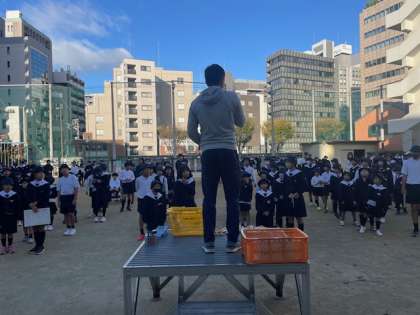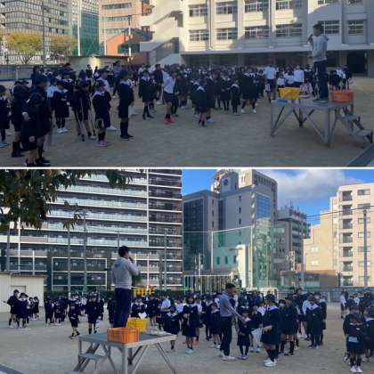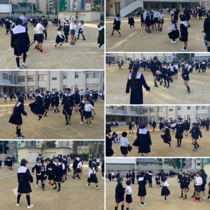 今週の体育朝会は、西天満大なわ集会に向けた練習を行いました。チームワークよく練習できているグループが多く見られました。
