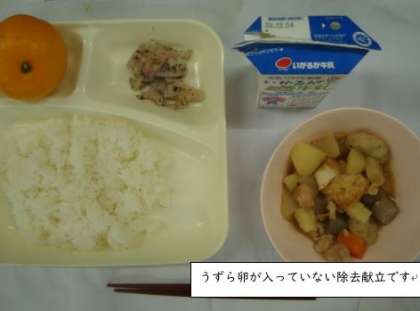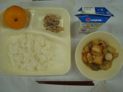 「関東煮 れんこんの赤じそあえ みかん ごはん 牛乳」