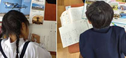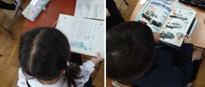 1年生の国語「『のりものカード』をつくろう」の学習の様子です。前の単元「いろいろなふね」で学習したことを生かして、一人ひとり自分が知りたい乗り物について調べました。どのような役目があるのか、どんなつくりになっているのか、本で調べたことをプリントにまとめ、のりものカードをつくっています。